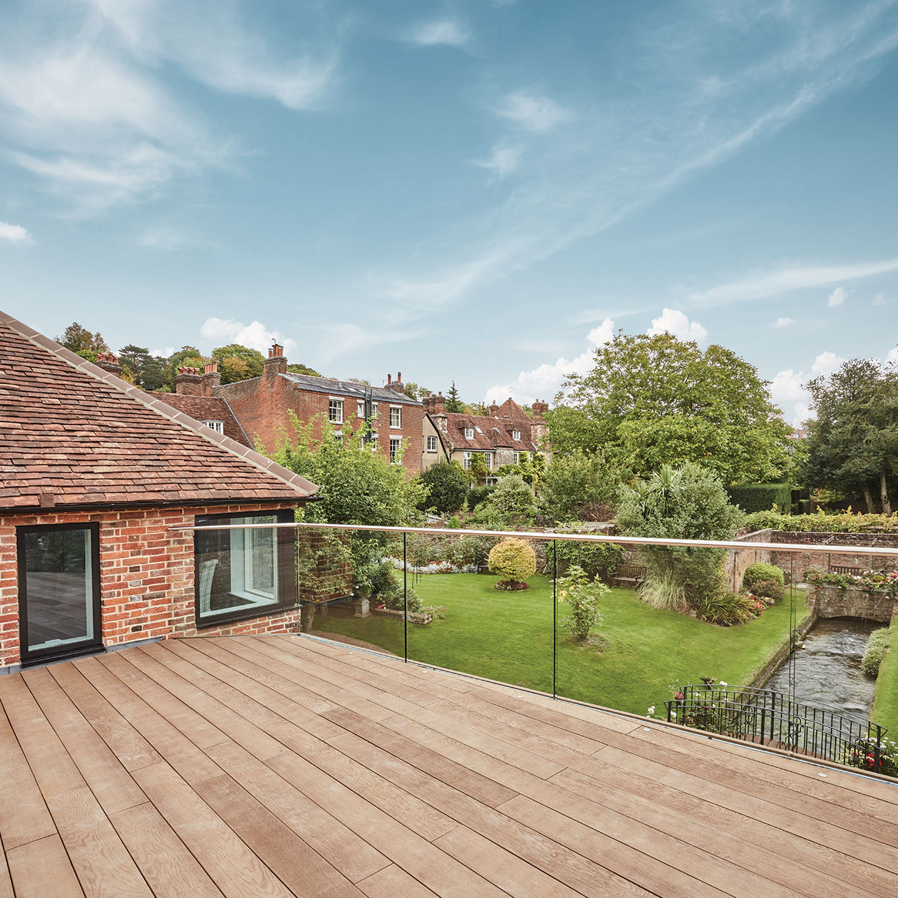 On top of the ancient river wall, the glass balustrade provides uninterrupted views towards the weirs and the much loved riverside walk through Winchester.